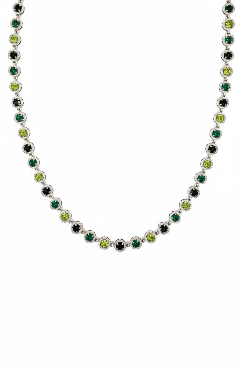 Una fila di piccoli zirconi incastonati che alternano riflessi chiari e scuri, per un effetto grafico super chic che illumina subito il décolleté. La montatura tonda in acciaio avvolge ogni pietra come una mini cornice, richiamando le luci di una città di notte. Indossala da sola per un look elegante oppure abbinala a collane più sottili per un layering deciso, perfetto dal blazer alla t-shirt bianca.